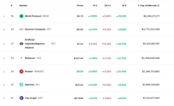 Por otro lado; Fetch.AI (FET) y Render Token (RNDR) encabezan las ganancias semanales en criptomonedas, impulsadas por el auge en el sector de la inteligencia artificial.