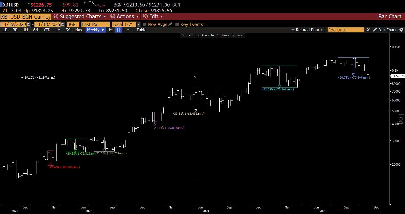Desde finales del 2022, Bitcoin ya vivió 7 caídas entre 20% y 40%, cinco de ellas clasificadas como “bear markets cortos”.