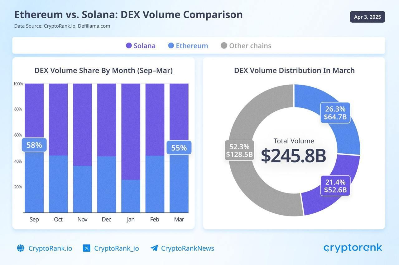 En marzo, Ethereum superó a Solana en volumen DEX por primera vez desde septiembre, con 26.3% ($64.7B) de un total de $245.8B.
