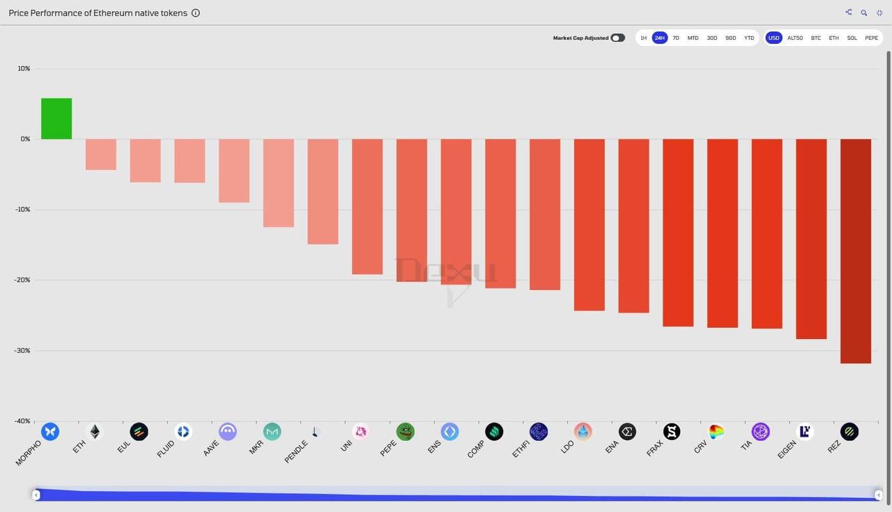 En las últimas 24 horas, la mayoría de tokens nativos del ecosistema Ethereum registraron fuertes caídas. Sin embargo, protocolos de lending como Morpho, Euler, Fluid y Aave lograron un mejor desempeño, destacándose frente a plataformas de stablecoins, DEXs y soluciones de staking líquido.