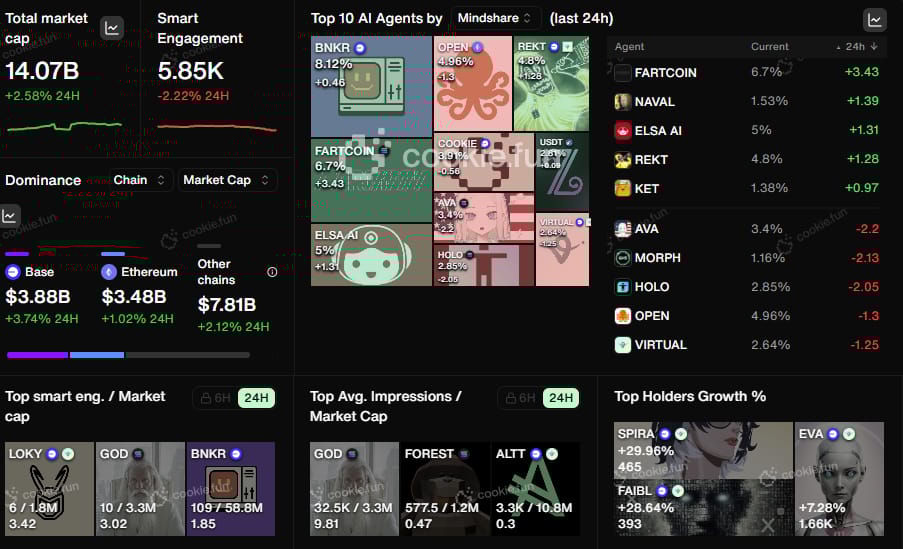 - BNKR, FARTCOIN y ELSA AI fueron los ganadores del día en alza de mindshare.