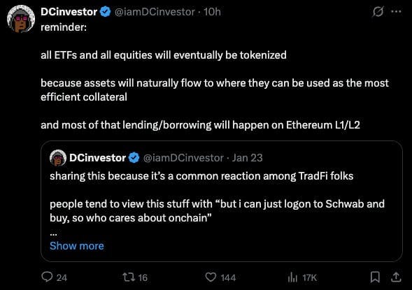 Lo más interesante es que probablemente usen Ethereum para hacer esto, ya que ahí está BUIDL. Esto podría hacer que ETH y las stablecoins sean los grandes ganadores de este movimiento.