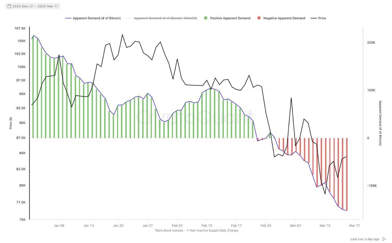 Desde diciembre, la demanda de Bitcoin ha bajado mucho y sigue débil. Los inversores están vendiendo más que comprando y prefieren activos más seguros.