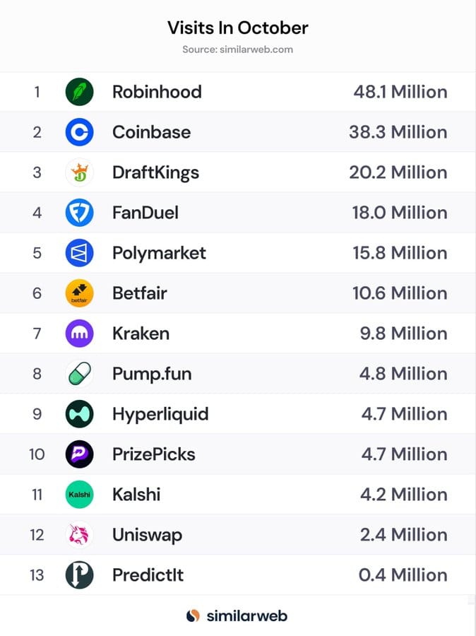 📊 Polymarket atrajo a 15.8 millones de visitantes en octubre, posicionándose en el 5° lugar entre las apps de trading y apuestas.