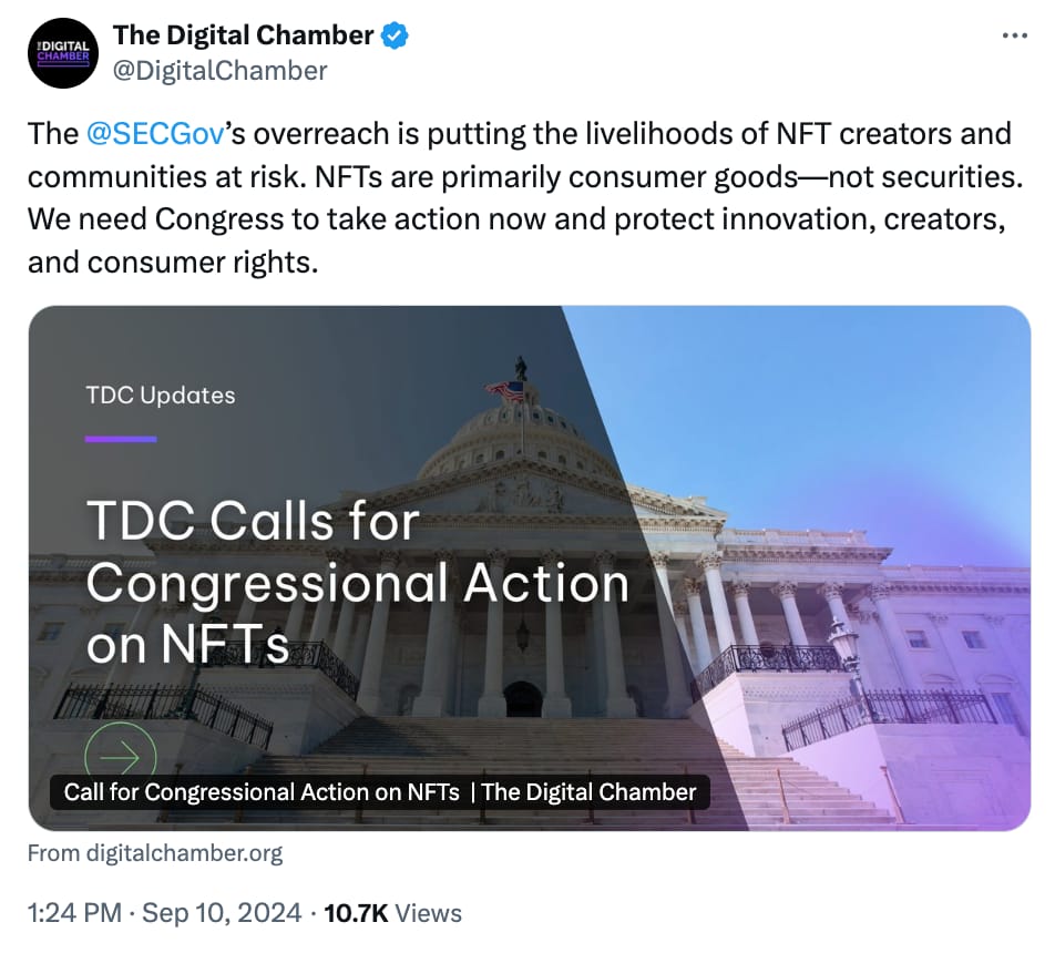 Esto llamó la atención de la Cámara Digital, un grupo que apoya las industrias de cripto y blockchain. Ellos creen que la SEC está exagerando y quieren que el Congreso deje claro que los NFTs son coleccionables, no productos financieros.