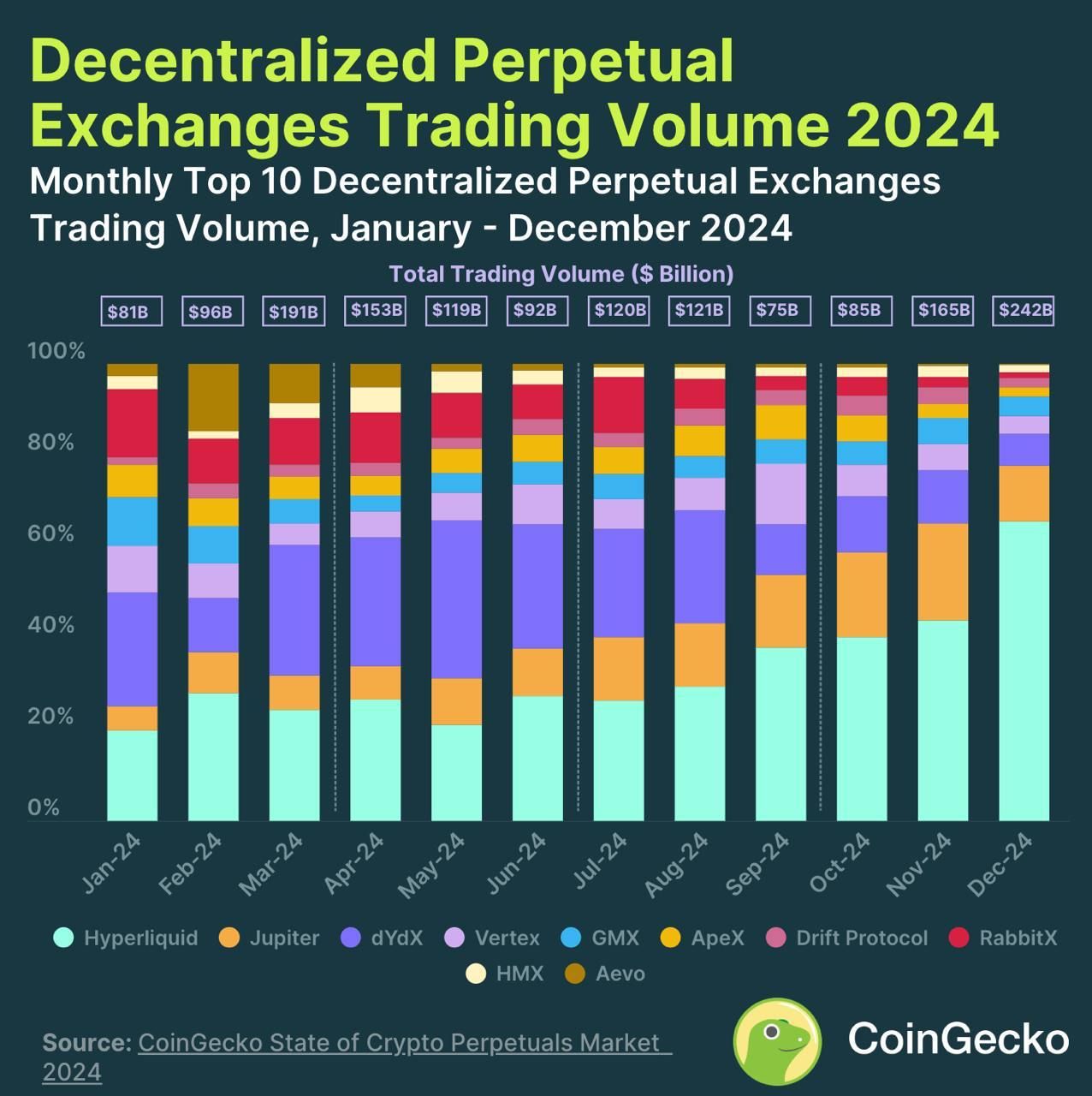 Tras el airdrop de su token $HYPE, Hyperliquid capturó más del 50% del volumen en exchanges descentralizados de perpetuos en 2024, alcanzando 66% en diciembre.