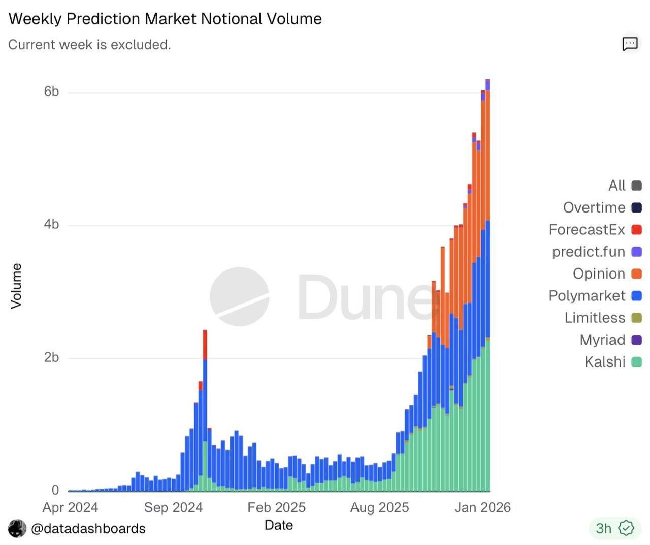 Los mercados de predicción ya operan como un oligopolio. Kalshi, Opinion y Polymarket concentran casi todo el volumen, mientras el total semanal ya supera los $6B. La actividad no se reparte: se acumula.