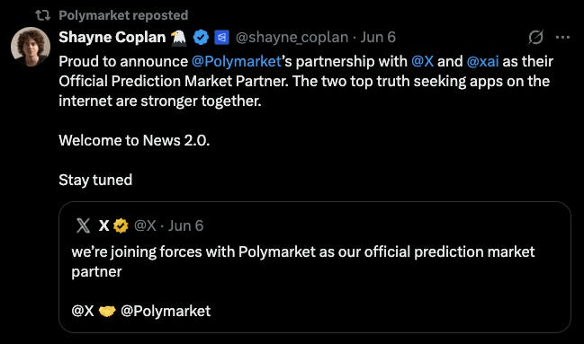 En lugar de estar confinados a unas cuantas personas, Polymarket está escalando a una de las plataformas de redes sociales más grandes del mundo, con respaldo de Elon Musk.