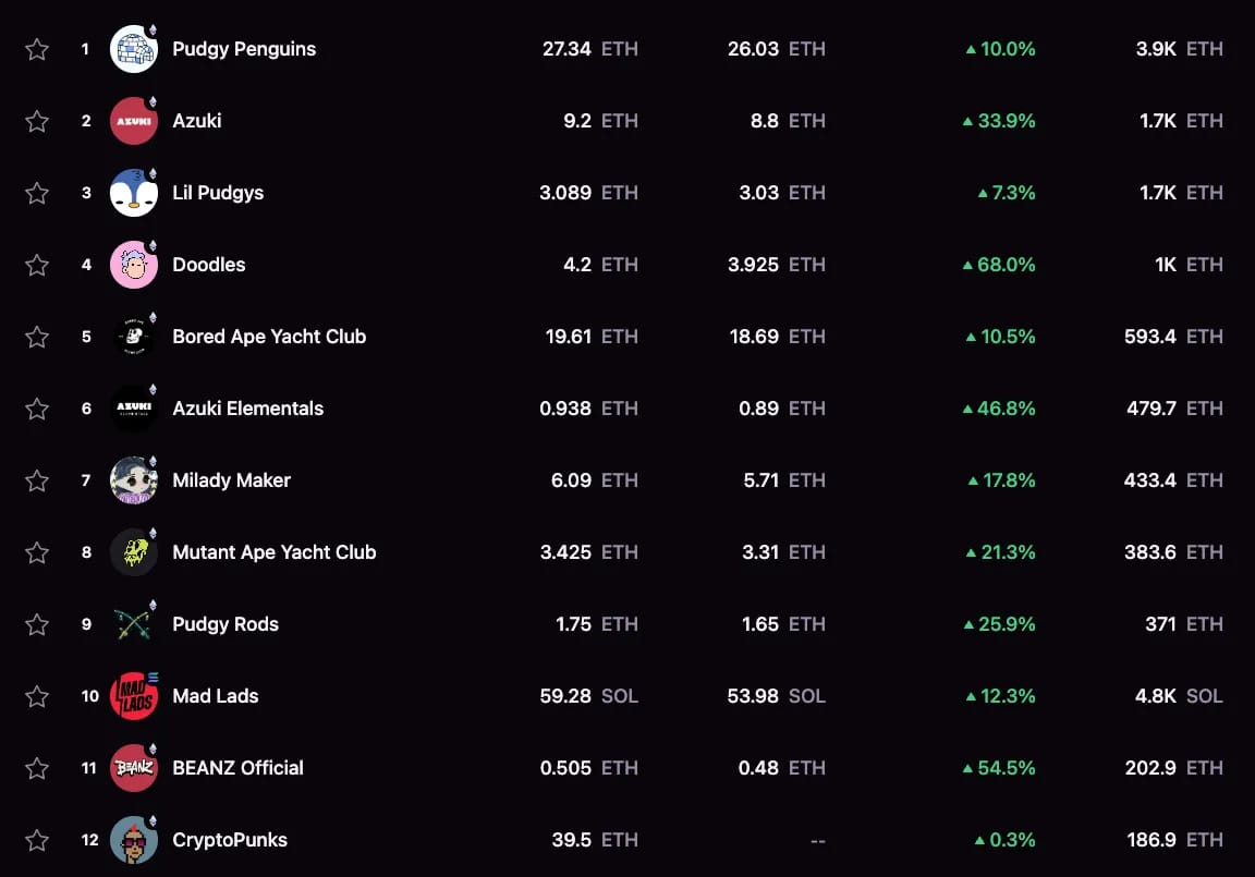 Azuki logró un récord con un aumento del 33%, y Elementals y Beanz asombraron con incrementos del 47% y 55%, respectivamente.
