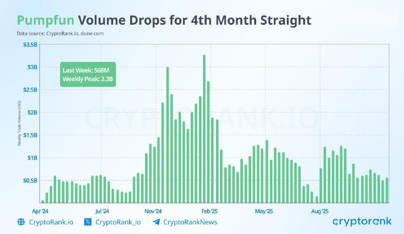 El volumen semanal en Pumpfun cayó de $3.3B a $568M en solo cuatro meses, reflejando el declive de una de las narrativas más explosivas del retail. La creación de nuevos tokens también se ha desacelerado notablemente.