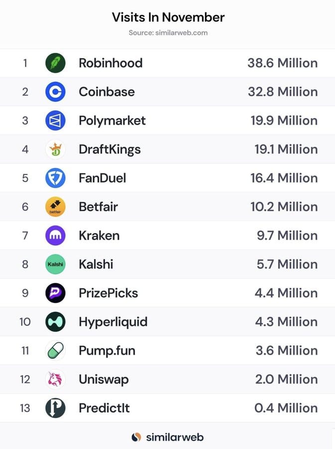 🏆 Polymarket superó a DraftKings y FanDuel en visitas durante noviembre, quedando en un impresionante tercer lugar, justo detrás de Robinhood y Coinbase.