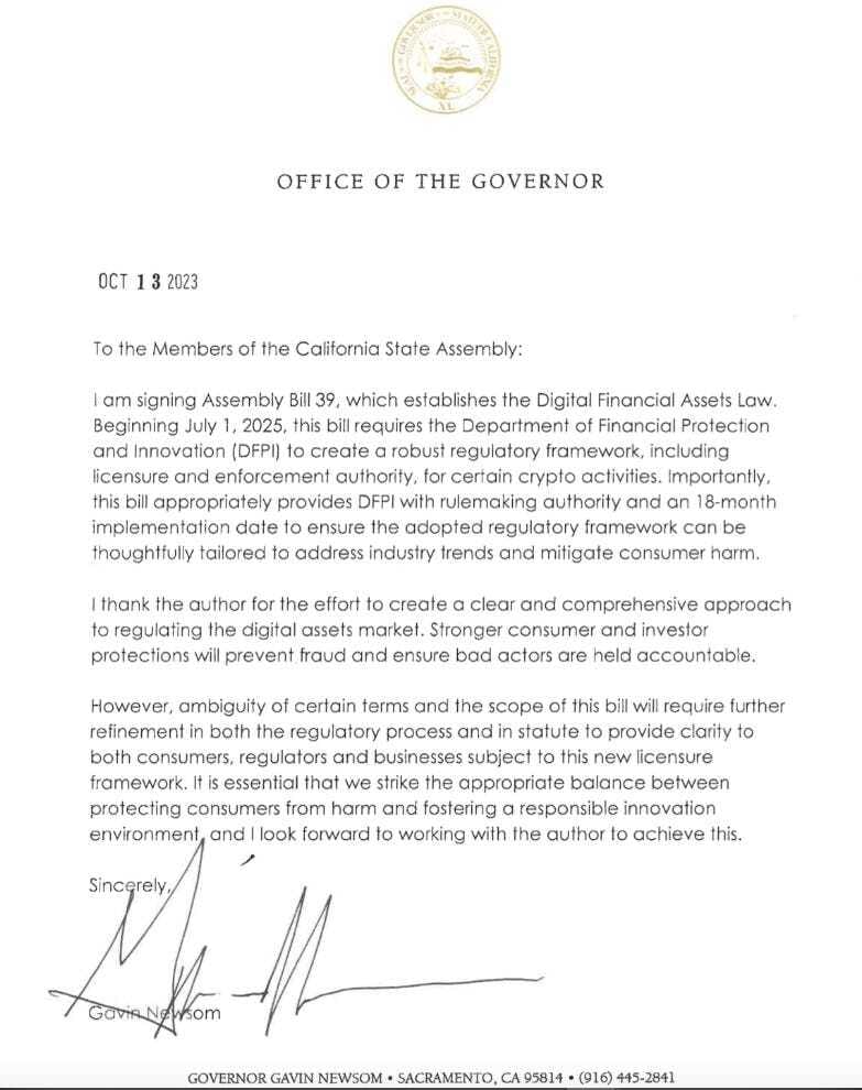 El gobernador Newsom de California acaba de aprobar una nueva ley que regulará las criptomonedas a partir de 2025. Básicamente, obligará a las empresas de crypto a obtener licencias y llevar registros detallados que los reguladores puedan auditar.