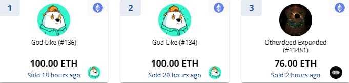 DeGod #5996 llego a ser la segunda venta más alta del día por 70 ETH, pero después God Like #134 lo sustituyo.