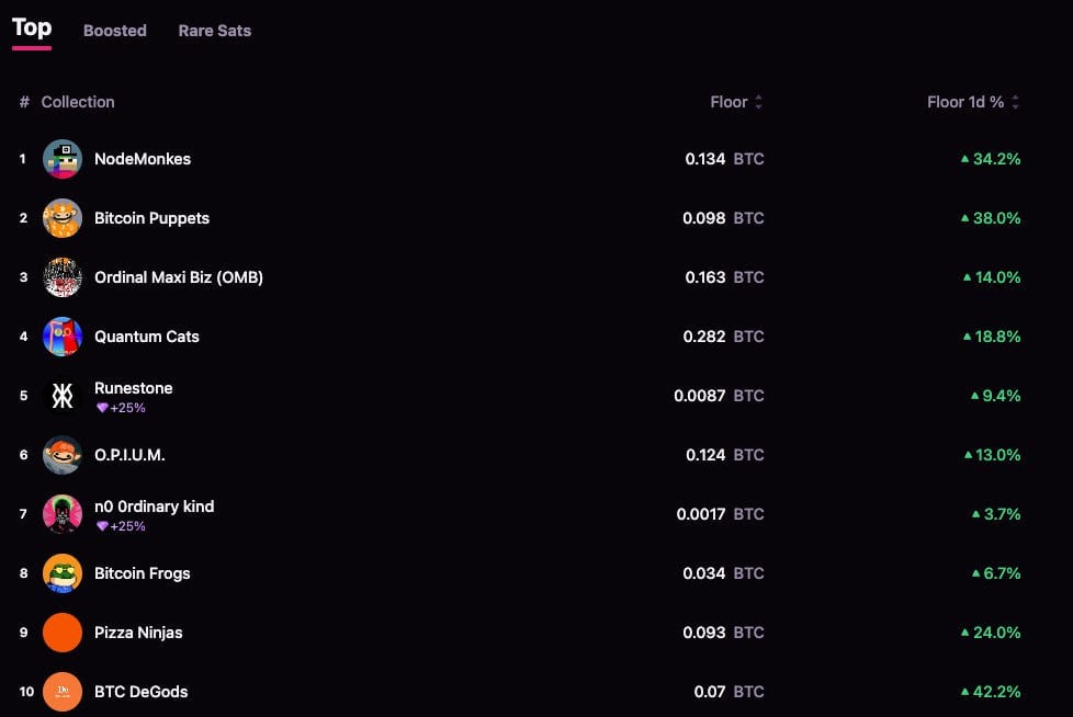 BTC Ordinals: Estos están liderando la carga, con nombres importantes como Nodes y Puppets viendo un aumento del 35-40%.
