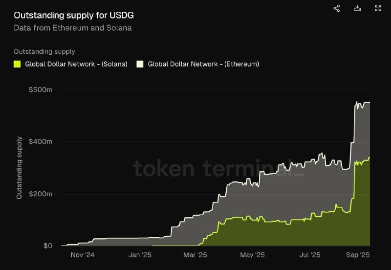 El suministro de USDG superó los $600M en septiembre, impulsado por su adopción en Ethereum y un reciente despegue en Solana. Su crecimiento lo coloca entre los nuevos candidatos a competir con Tether y USDC.