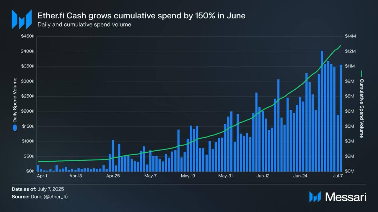 Tras liderar el restaking con 2.5M ETH, ether.fi impulsa su neobanco con Cash, que ya acumula $14.85M en gasto. En junio, el volumen subió 150%. Apuntan a 100K usuarios con tarjeta.