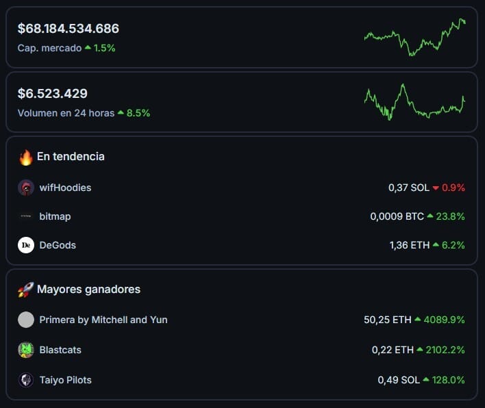 🟠 Ordinals: NodeMonkes subió +1% (0.14 BTC), pero Puppets y Quantum Cats bajaron un 1% cada uno.