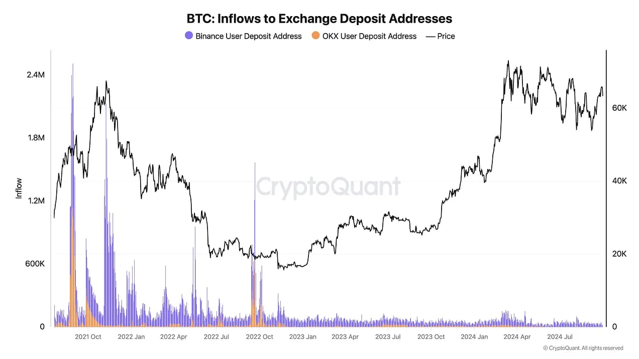 Las entradas de BTC a direcciones de intercambio han caído más del 95%