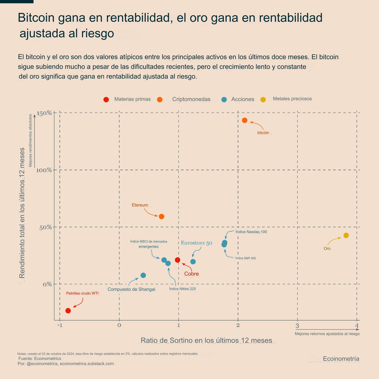 Si te acercas al gráfico, notarás que el oro no solo es más seguro, sino que también está ofreciendo buenos rendimientos en general. Mientras tanto, Bitcoin, a menudo visto como el comodín, también brilla con rendimientos ajustados por riesgo bastante impresionantes.