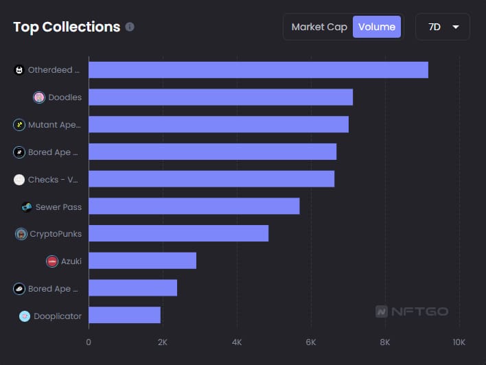 Es refrescante ver a Doodles como la segunda colección con más volumen, recordemos que acaban de hacer su expansión a la blockchain flow lo cual explica su alto volumen.