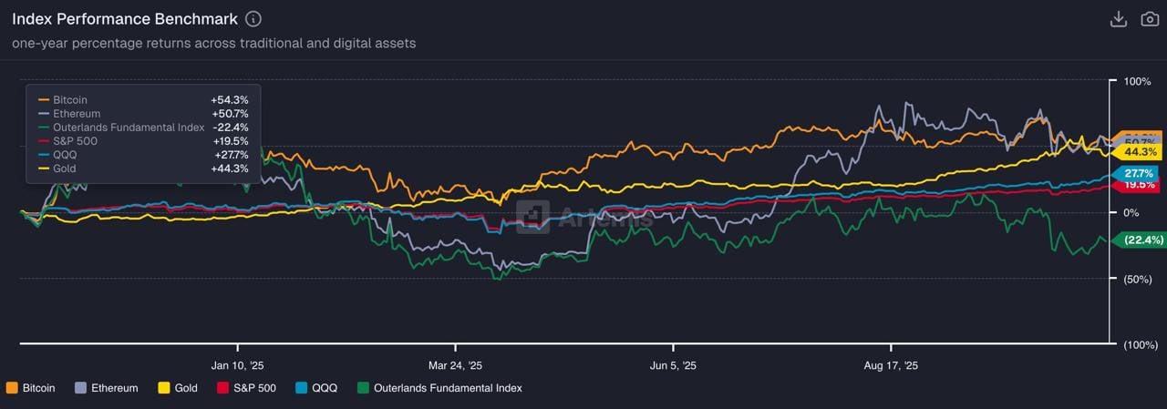 Robinhood lidera el rally en activos ligados a tokenización, stablecoins y mercados de predicción, con un aumento del 425% en el último año. En comparación, Bitcoin (+54%) y Ethereum (+50%) quedaron rezagados, junto a activos tradicionales como oro (+44%) y el S&P 500 (+19%).