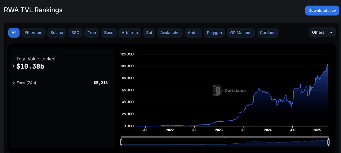El valor total manejado por protocolos que trabajan con activos del mundo real ha superado los $10.4 mil millones en 79 plataformas descentralizadas.