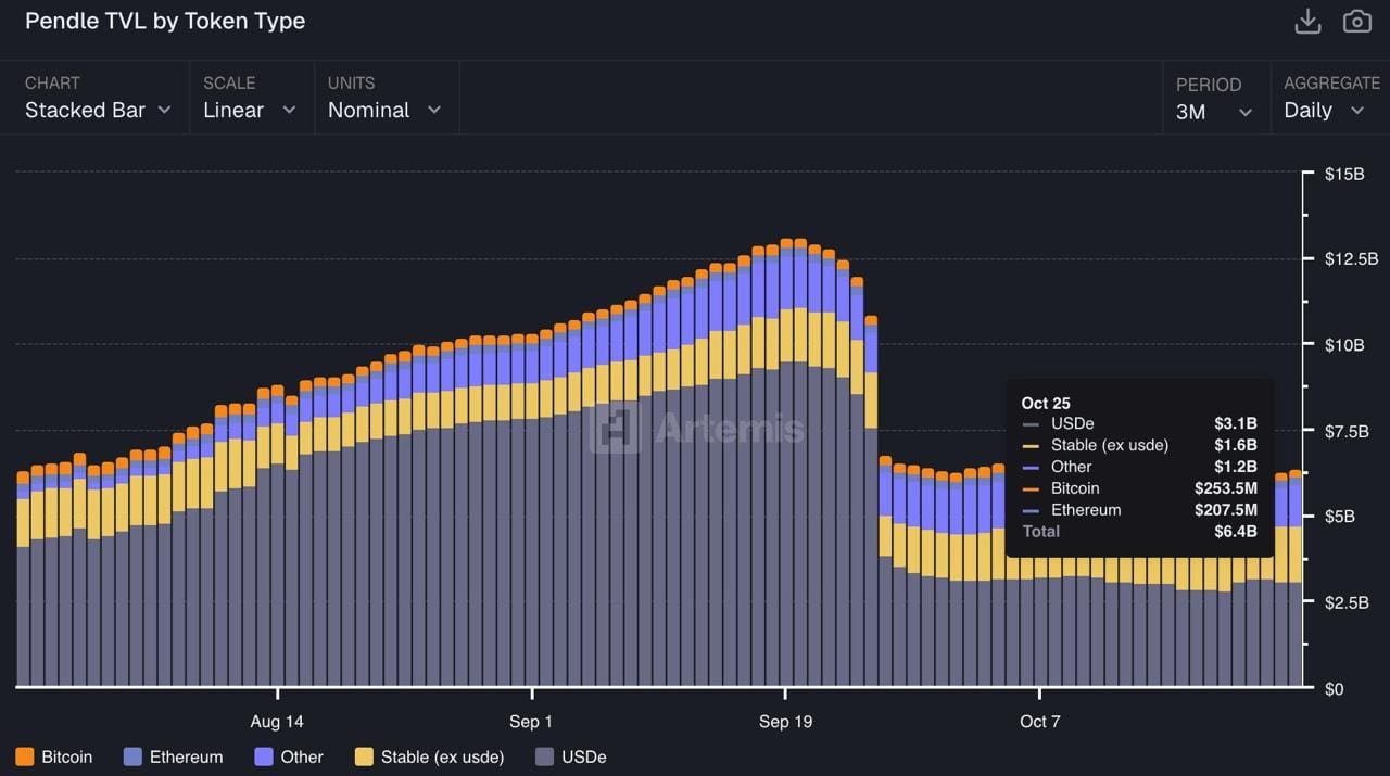 El TVL en Pendle cayó de casi $14B a $6.4B en dos semanas, y ahora más del 70% proviene de stablecoins, con USDe liderando ($3.1B). Esta rotación marca un cambio en las dinámicas del protocolo, que antes dependía de ETH y BTC restakeados.
